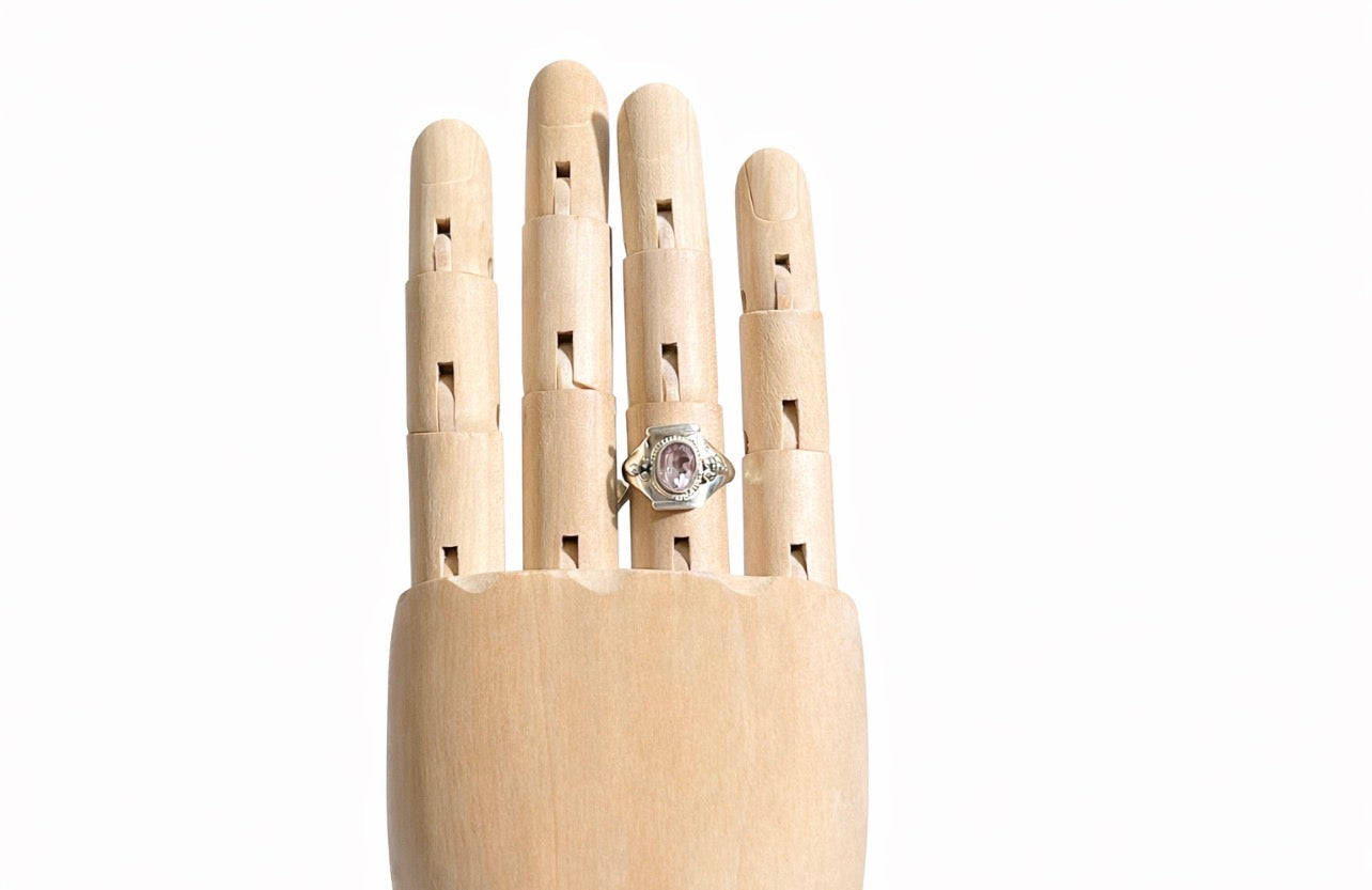 A solid sterling silver ring set with a soft lavender amethyst, framed by detailed silverwork and subtle side accents. The band has a substantial feel without being bulky, and the setting sits low enough for everyday wear.