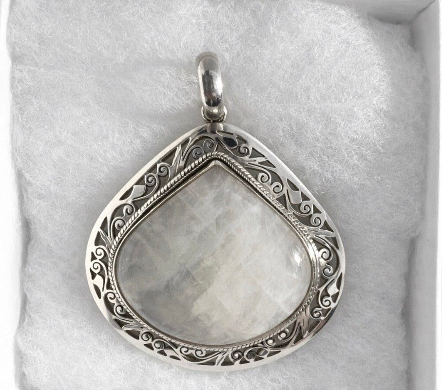 This pendant features a large natural moonstone set in solid sterling silver. The stone has a soft, cloudy glow with flashes of light that shift as it moves, which is what makes moonstone so appealing in the first place.