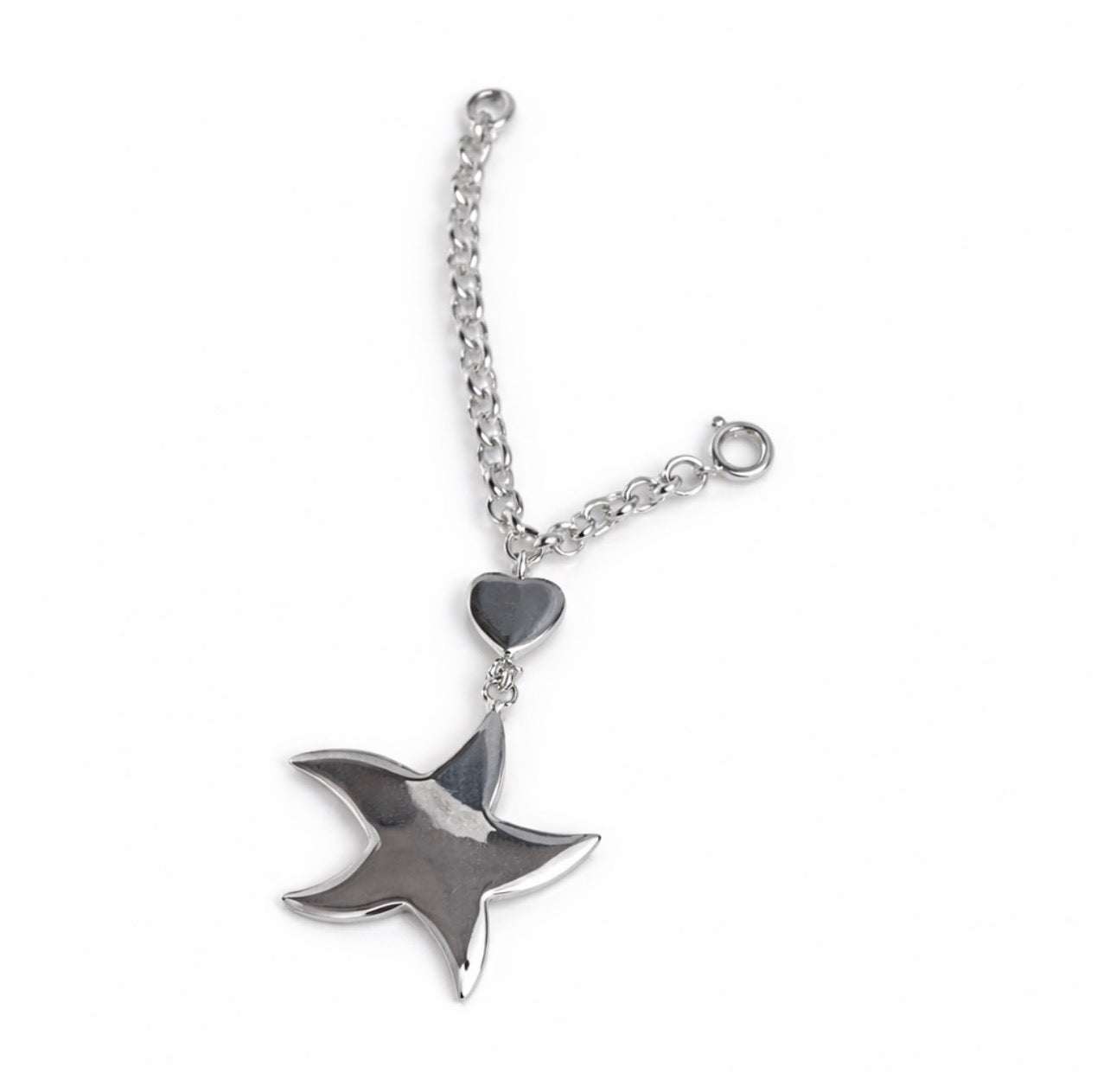 A polished sterling silver handbag charm featuring a fluid star drop suspended from a petite heart accent. Crafted in solid 925 silver, this lightweight piece adds a subtle shine to handbags, totes, or key rings without overpowering the look. Finished with a classic link chain for easy attachment.
